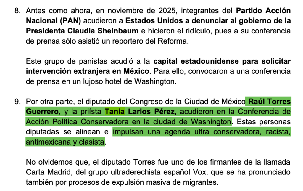 Apenas en febrero de 2026, Tania Larios viajó junto a Raúl Torres Guerrero para participar en la Conferencia Política de Acción Conservadora (CPAC), donde ultras de Estados Unidos promueven la vida, la propiedad privada, la contrainmigración y políticas conservadoras, tal como lo detalla una minuta del diputado Alberto Martínez Urincho.