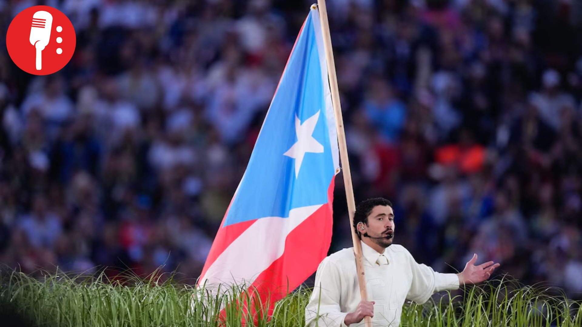 El artista agitó una versión de la bandera puertorriqueña con el triángulo azul claro y las franjas rojas y blancas, símbolo que alude a la aspiración de autonomía de la isla, que actualmente sigue siendo territorio de Estados Unidos.