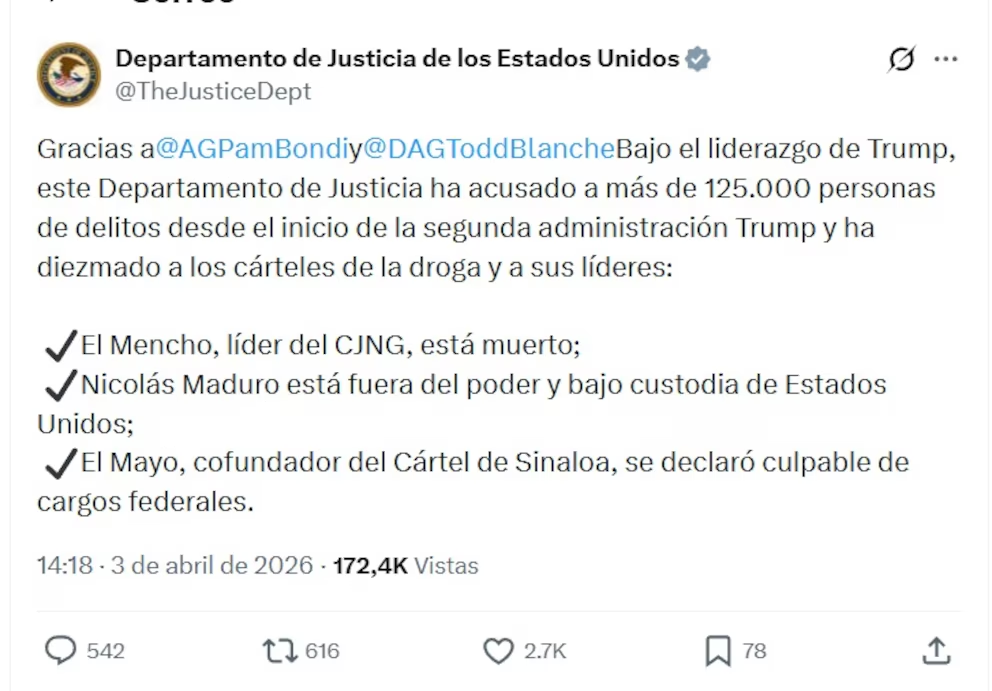 A través de redes sociales, la dependencia estadounidense aseguró que bajo el liderazgo de Bondi se “diezmó” a los cárteles, incluyendo estos casos emblemáticos. Sin embargo, la narrativa ha sido señalada como engañosa, ya que omite el papel central de las fuerzas mexicanas en ambos hechos.