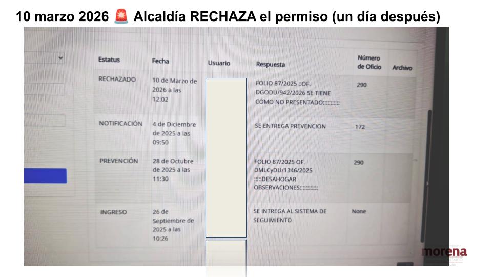 De acuerdo con registros del sistema SACNET, filtrados por trabajadores de la propia alcaldía, el trámite siguió su curso durante meses sin resolverse. La cronología muestra queel ingreso se realizó en septiembre de 2025 y, tras varias etapas administrativas,fue hasta el 10 de marzo de 2026 a las 12:02 horas cuando el permiso fue finalmente rechazado, pese a que el colapso —en el que murieron tres trabajadores— ocurrió el día 9.