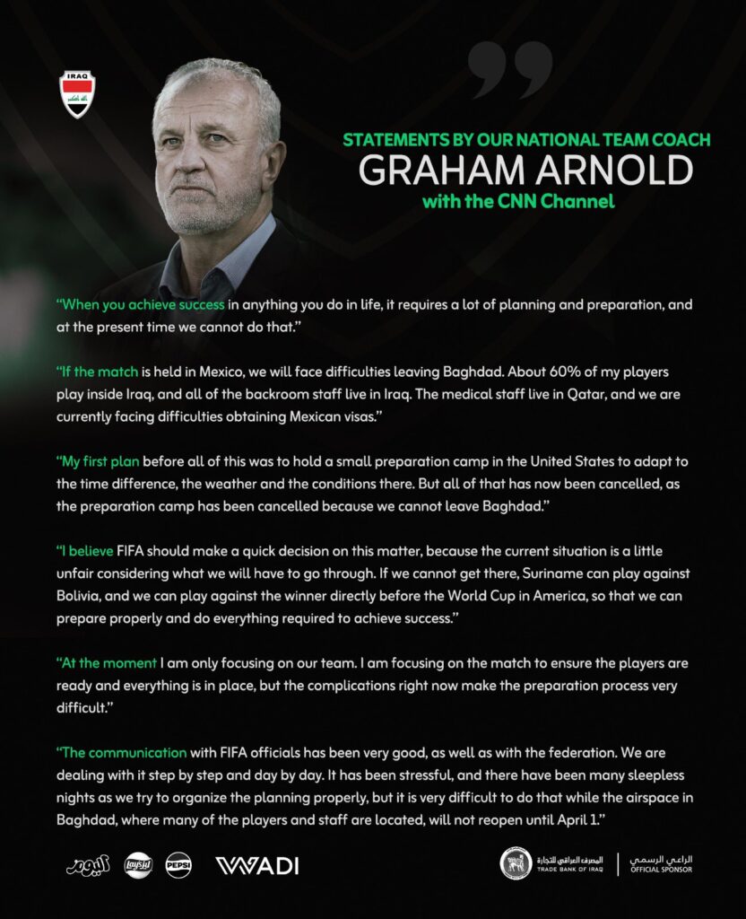 Por medio de la cuenta oficial “X” del equipo nacional de Iraq (@IraqNT_EN), publicó la entrevista que tuvo director técnico de Iraq, Graham Arnold con CNN, compartió que pidió a la FIFA (@FIFAcom) que posponga el partido play off clasificatorio para el Mundial de Fútbol 2026 (@FIFAWorldCup), programado el 31 de marzo en Monterrey, contra el ganador del duelo entre Bolivia y Suriname.