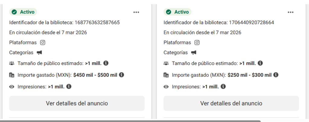 Mientras sus ingresos son limitados, su gasto diario en publicidad ronda los 208 mil pesos, con picos de hasta 267 mil pesos. En otras palabras, en un día gastan casi el doble de lo que ganan en todo un mes. Una incongruencia que desafía toda lógica.