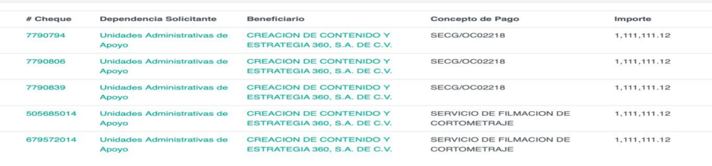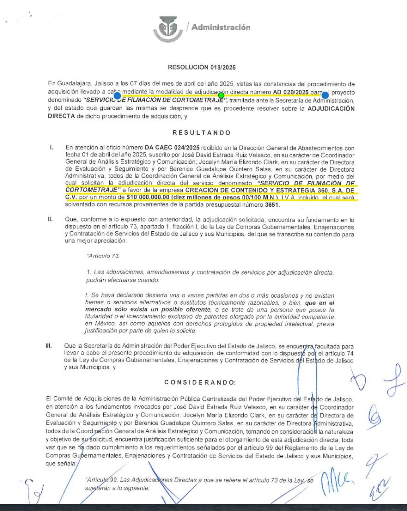 Entre enero y febrero, el Gobierno de Jalisco entregó a Creación de Contenido y Estrategia un total de 5 millones 555 mil 555 pesos, que fueron diferidos en cinco partidas por distintos conceptos. Dos de ellos atribuidos a la filmación de un “cortometraje”, cuyo precio se fijó en 10 millones de pesos, pero que, hasta el momento, el gobierno de Jalisco no ha especificado de qué se trata.