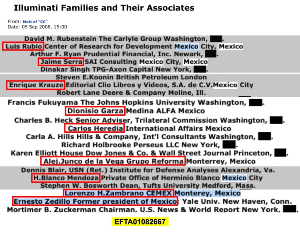 Un archivo del caso Epstein, identificado con la clave EFTA01082667, fechado el 5 de septiembre de 2008 y titulado “Familias illuminati y sus asociadas” incluye nombres de diversos políticos, empresarios y académicos de alcance internacional, entre ellos mexicanos, como el presidente de Grupo Reforma y Editorial Clío.