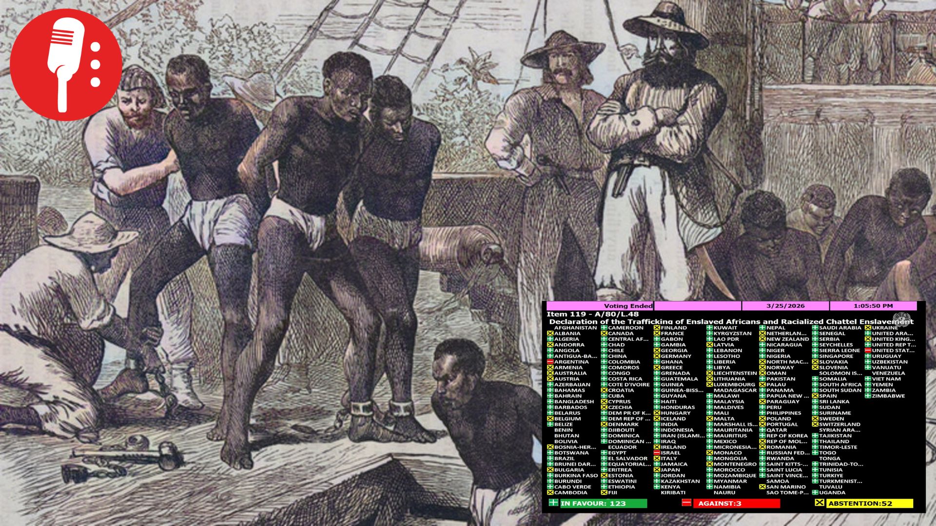 La Asamblea General de las Naciones Unidas aprobó, con 123 votos a favor, la resolución que califica la esclavitud africana como “el crimen de lesa humanidad más grave” de la historia. Sin embargo, Argentina, Israel y Estados Unidos votaron directamente en contra, mientras que hubo  52 abstenciones, donde se encuentran gran parte de los países históricamente implicados en la esclavitud.