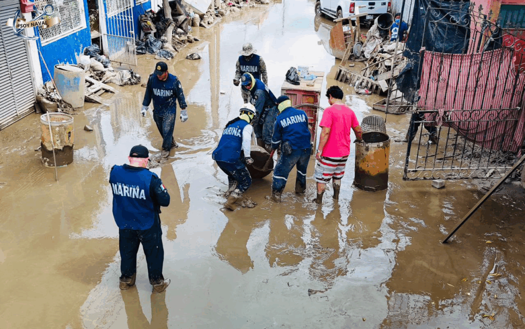 La institución naval activó el Plan Marina, desplegando 4 mil 240 elementos para apoyar a las familias afectadas. Las brigadas realizan limpieza de viviendas inundadas, desinfección de escuelas y centros comunitarios, remoción de lodo en calles y avenidas, y utilizan maquinaria pesada para despejar vialidades y restablecer el tránsito seguro.