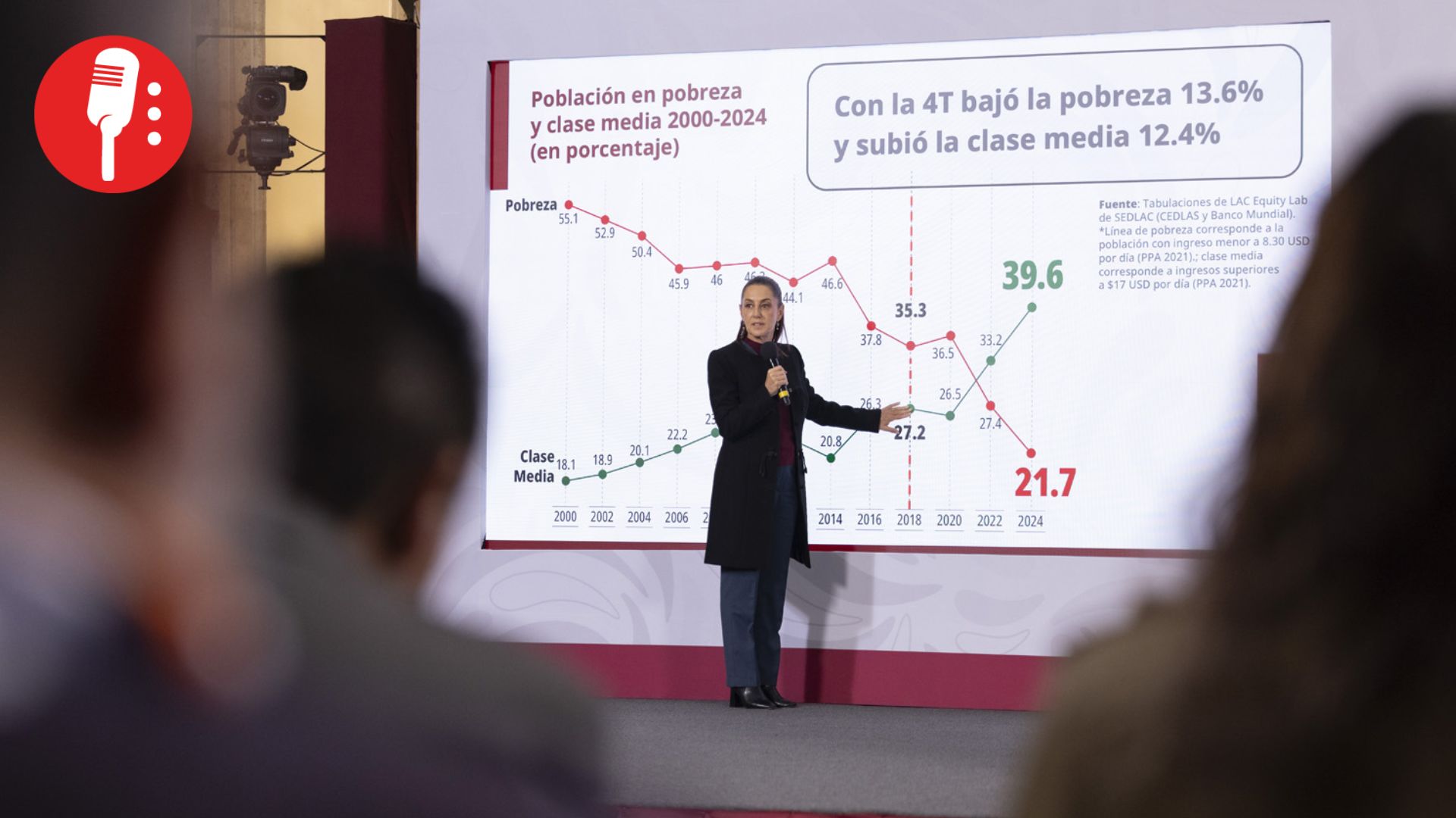 La presidenta Claudia Sheinbaum Pardo informó que, en siete años de gobiernos de la Cuarta Transformación, la pobreza en México se redujo 13.6%, mientras que la clase media creció 12.4%, de acuerdo con cifras del Banco Mundial, resultado directo de la política de bienestar, el incremento al salario mínimo y la consolidación de programas sociales como derechos constitucionales.