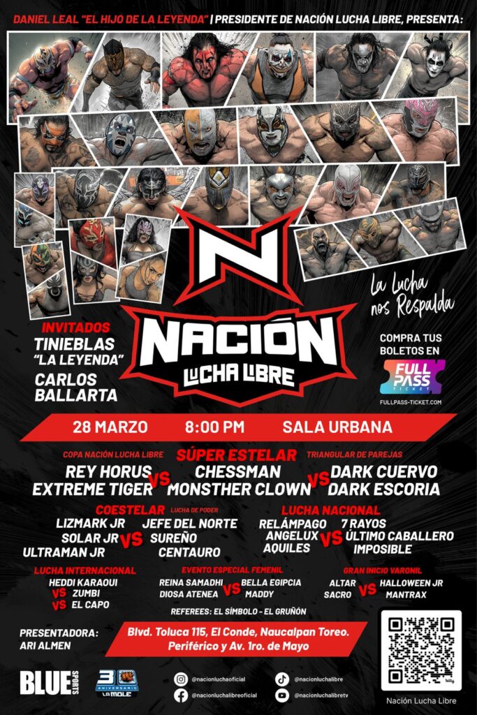 Nación Lucha Libre marcará su regreso a los rings este sábado 28 de marzo de 2026 con una función en la Sala Urbana de Naucalpan, dando inicio a su tercera temporada bajo la dirección de Daniel Leal. Fundada en 2019 y respaldada por la figura del legendario “Tinieblas”, la empresa pretende retomar su esencia con el lema “La lucha nos respalda”.