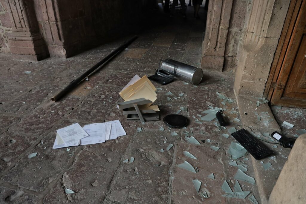 Una vez adentro, rompieron cristales, muebles y documentos, además de arrojar objetos desde los balcones. En videos difundidos en redes sociales se observa cómo los encapuchados prendieron fuego con bombas molotov a oficinas del edificio y realizaron pintas contra el gobernador Alfredo Ramírez Bedolla.