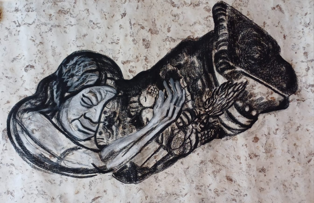 El dibujo Mujer abrazando a la Coatlicue expresa también esa necesidad de protegernos y vincularnos con una fuerza mayor, de manifestar el fervor en el abrazo.