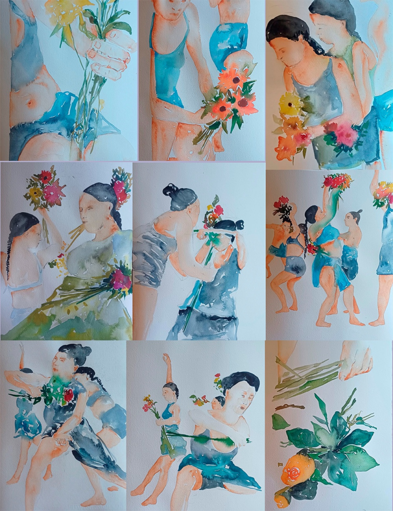En las acuarelas de Círculo de Afectos, los danzantes celebran y festejan cargando flores que funcionan como vasos comunicantes que los obligan a habitar el presente. Ahí mi necesidad es respirar, sentir la alegría como acción micropolítica, pues el sistema ha instrumentalizado nuestros cuerpos y descansar, hacer algo ocioso o festejar contradice la exigencia de ser siempre productivos.
